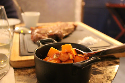Não podíamos visitar o Akla sem experimentar uma das suas carnes maturadas, cozinhadas no Josper, um forno a carvão que permite dar as propriedades fumadas duma típica grelha a carvão, mas também cozinhar de forma uniforme como num forno convencional. Excelente o Entrecôte Maturado, ainda que visualmente o tipo de corte mais parecesse vazia do que entrecôte (devido à camada de gordura localizada numa das extremidades), mas não percebo o suficiente sobre cortes de carne para ter a certeza disto. Portanto, resta-me comentar o excelente sabor que a carne tinha e o ponto perfeito em que vinha cozinhado, mal necessitando do uso da flor de sal que vem na tábua. Realmente fantástico!